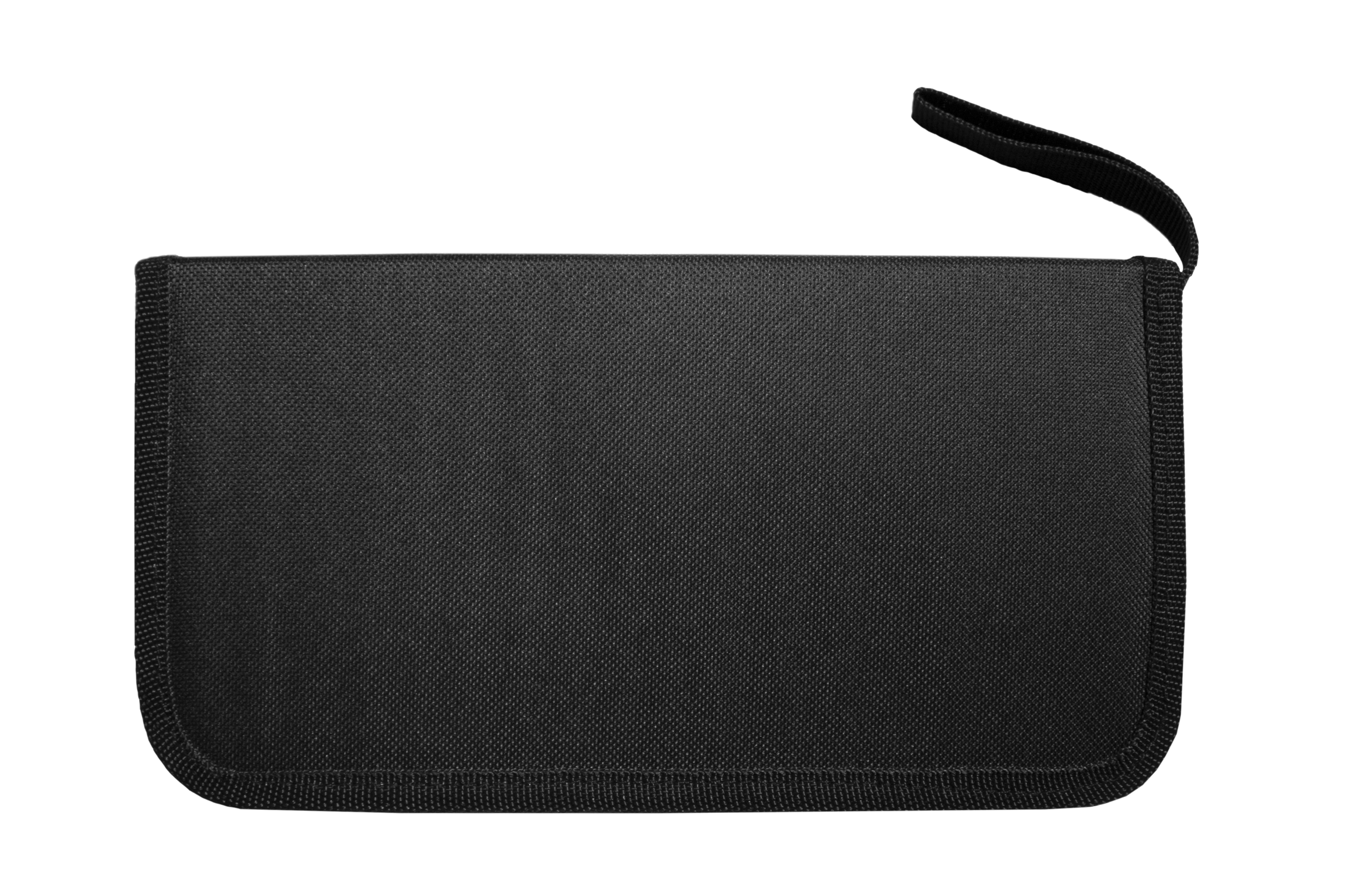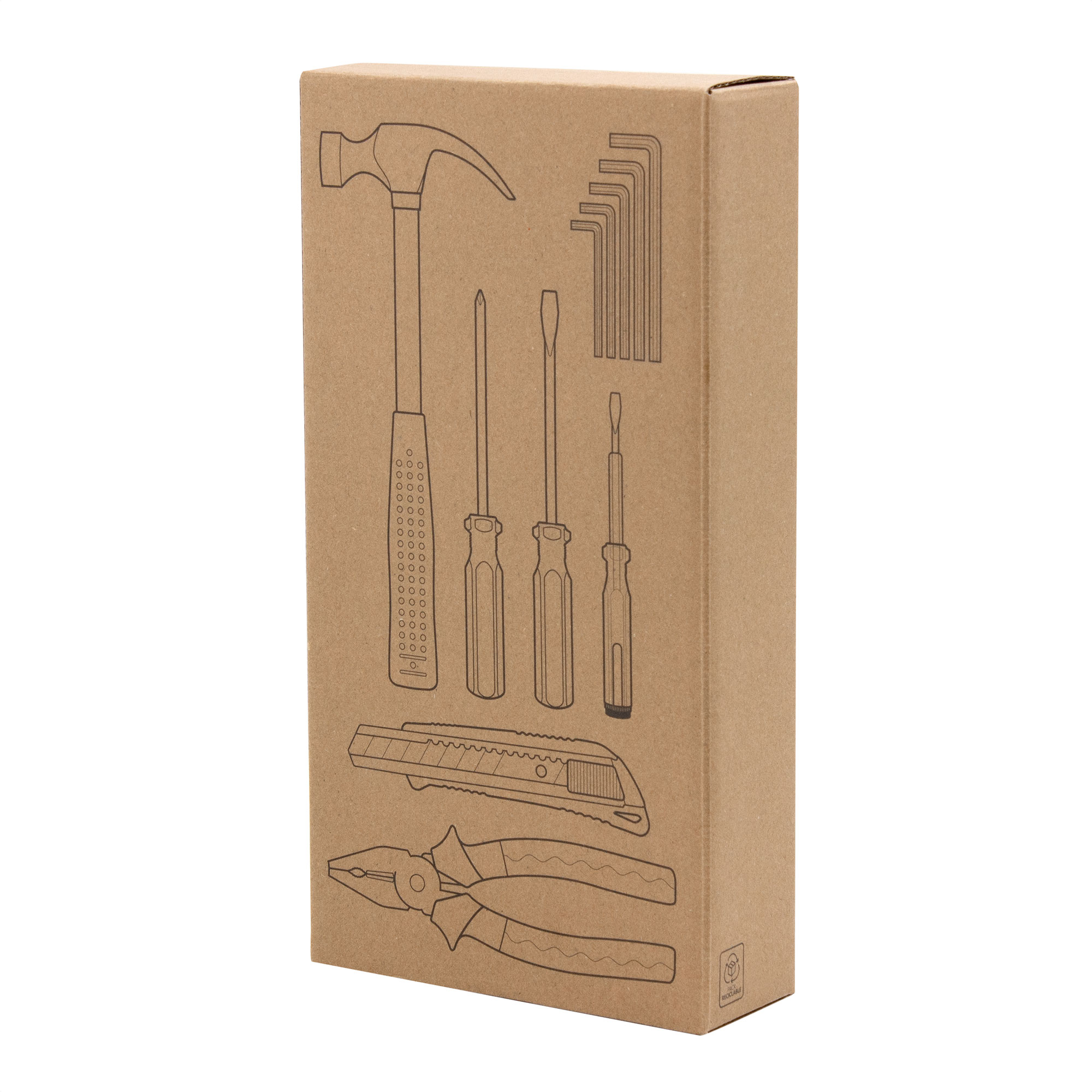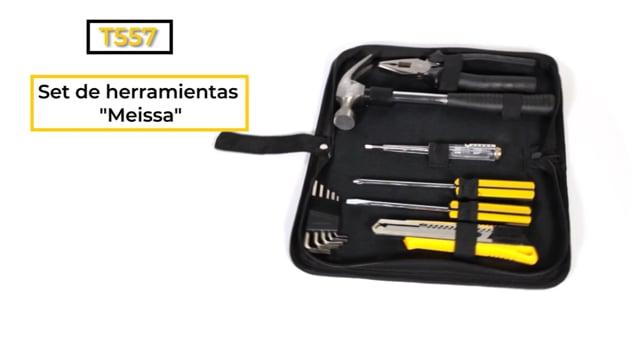 27 x 14 x 4,5 cm. (cerrado) /27 x 32,2 x 4,5 cm. (abierto) Poliéster 600D Oxford. Set de herramientas en estuche con cierre y creamallera. Contiene 11 piezas, todas sujetadas con elastico anti deslizante: Cuter, pinza alicate, martillo, 2 destornilladores de diferentes puntas (punta plana y punta phillps), un destornillador tester y 5 llaves allen. Presentación en caja de regalo.