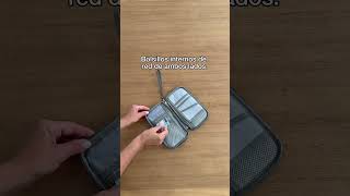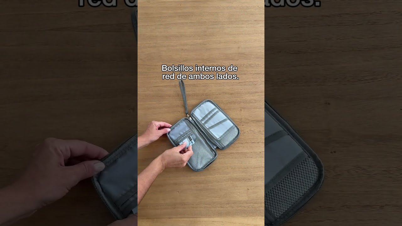 Billetera portadocumentos. Estructura acolchada con cierre perimetral y un bolsillo al frente. Bolsillos internos de red de ambos lados con múltiples espacios organizadores y un bolsillo con cierre. Correa de poliéster desmontable con mosquetón. Tirador de cierre metálico.