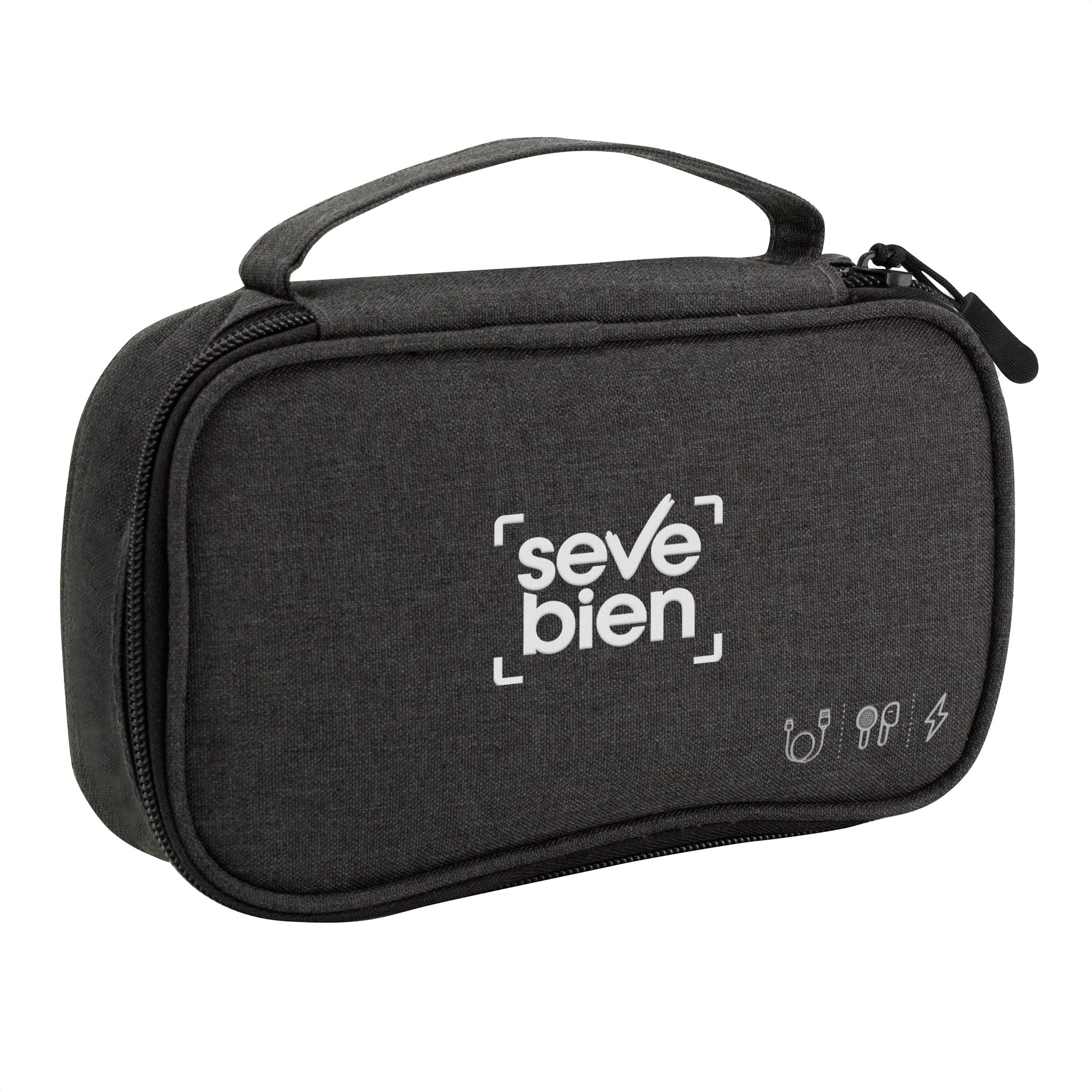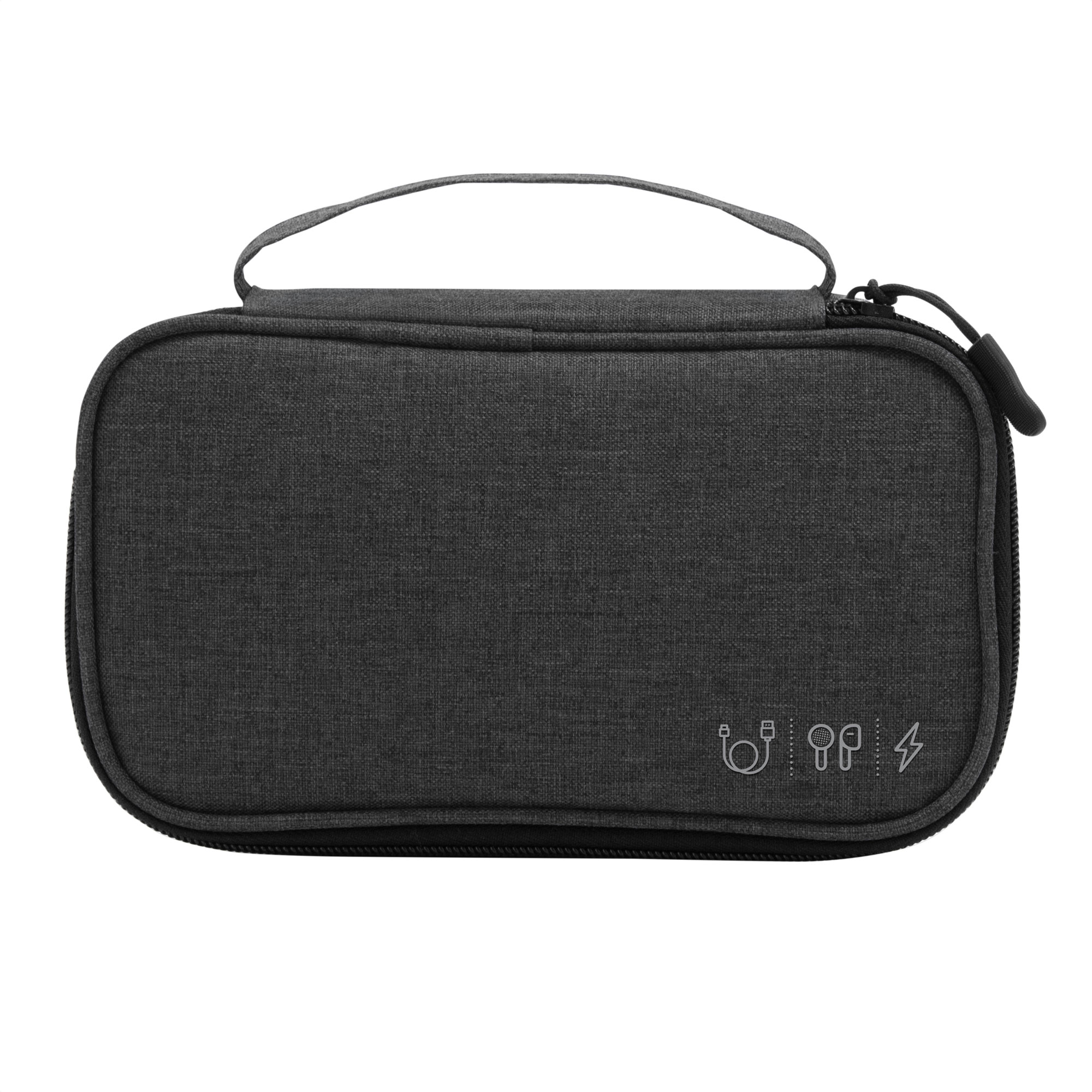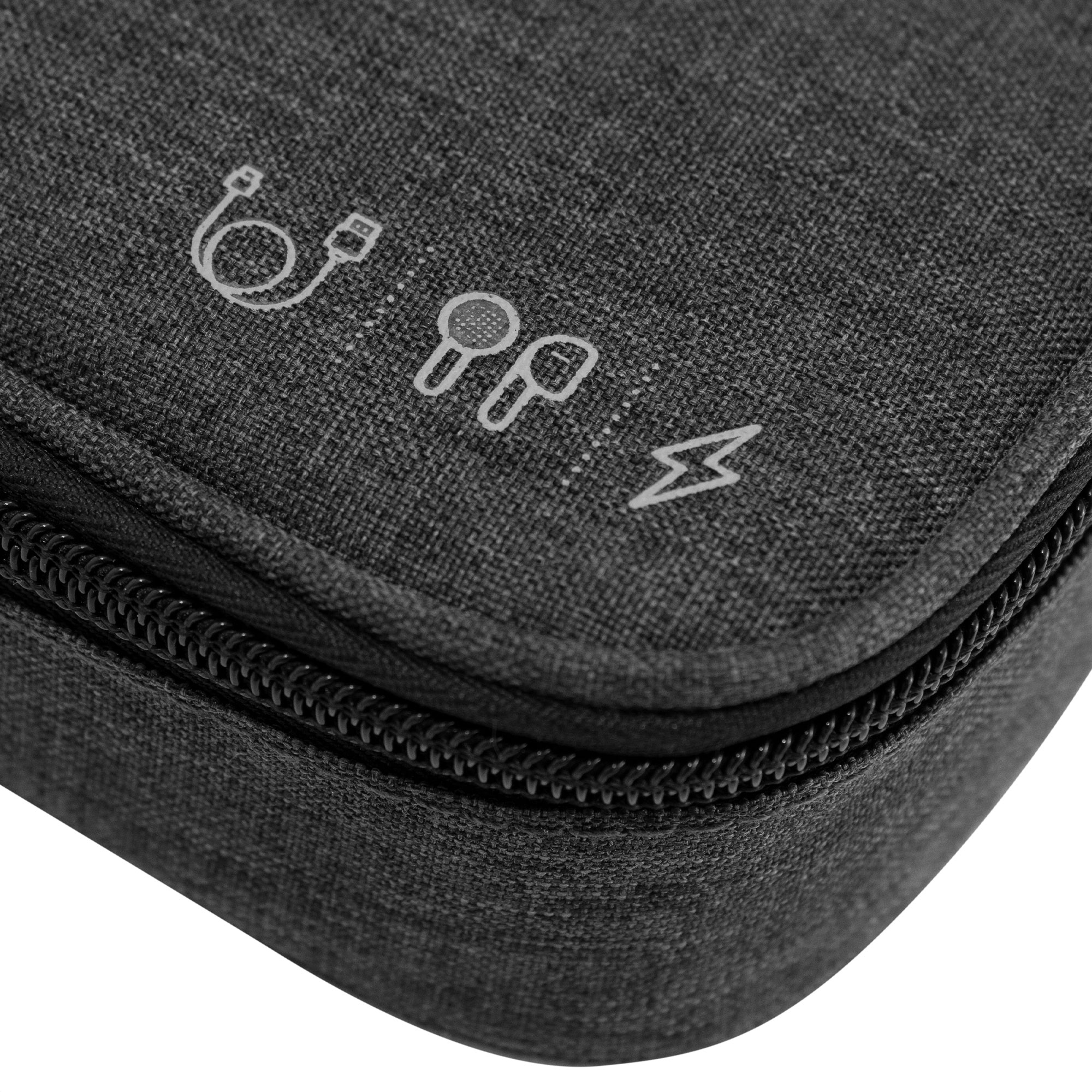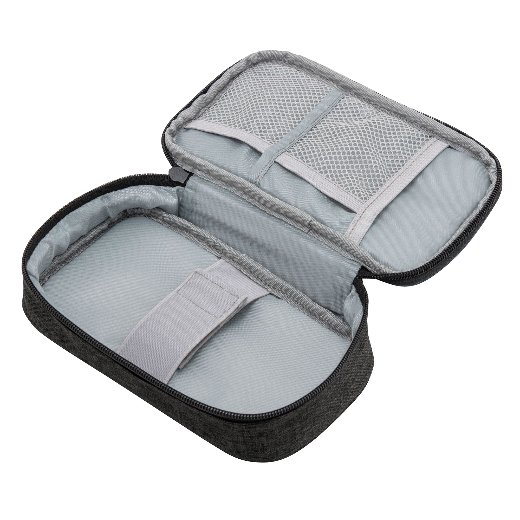 Organizador de cables. Estructura acolchada. Asa para transportar. Compartimento principal con cierre con tirador engomado. Interior forrado. En uno de sus lados cuenta con un bolsillo principal y dos pequeños de red, y en el lado contrario tiene un elástico con velcro multipropósito.