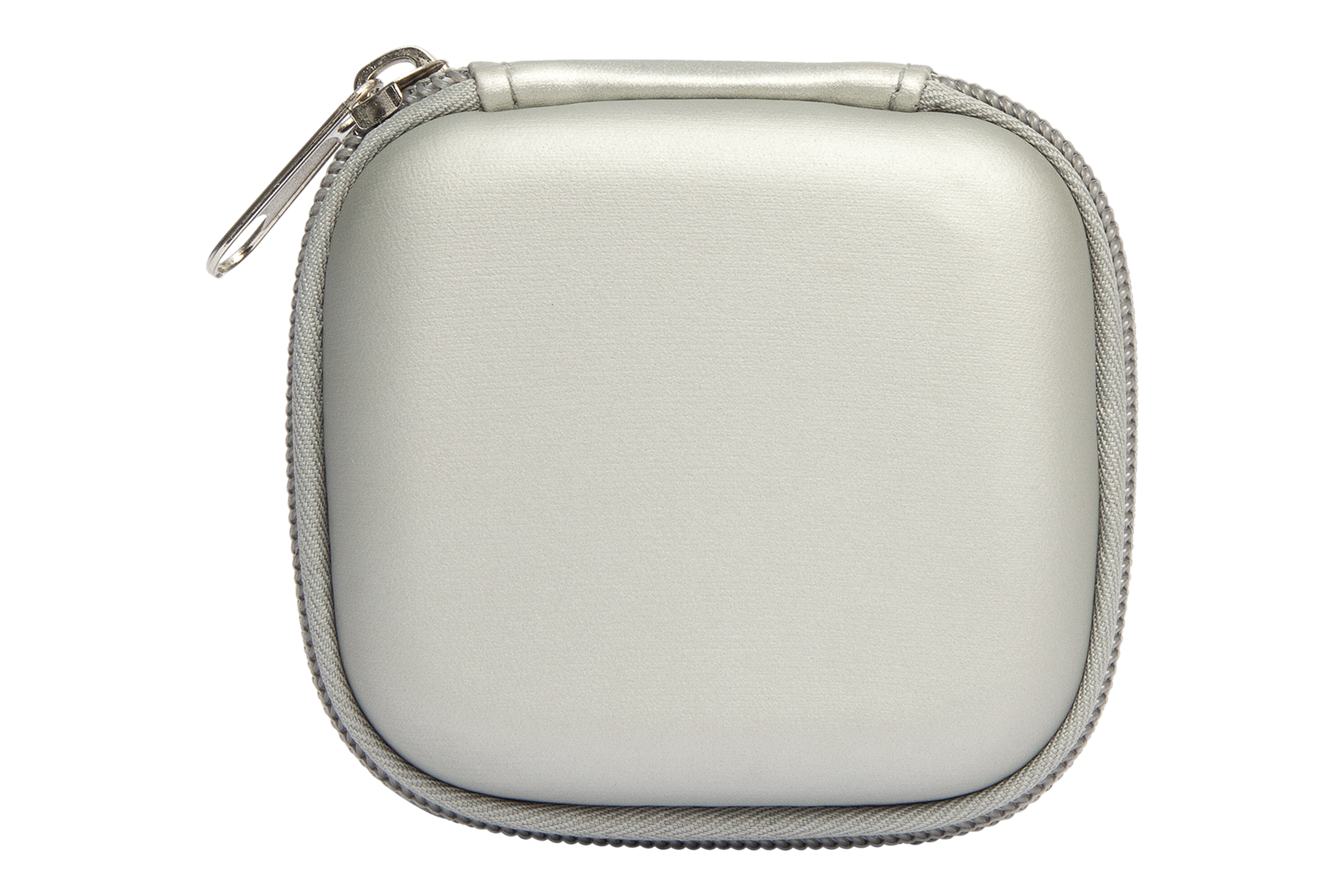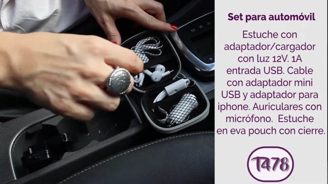 9,4 x 8,5 x 3 cm. Plástico. Estuche que incluye: adaptador/cargador con entrada USB, cable USB / mini USB con adaptador para Iphone y audífonos con micrófono.