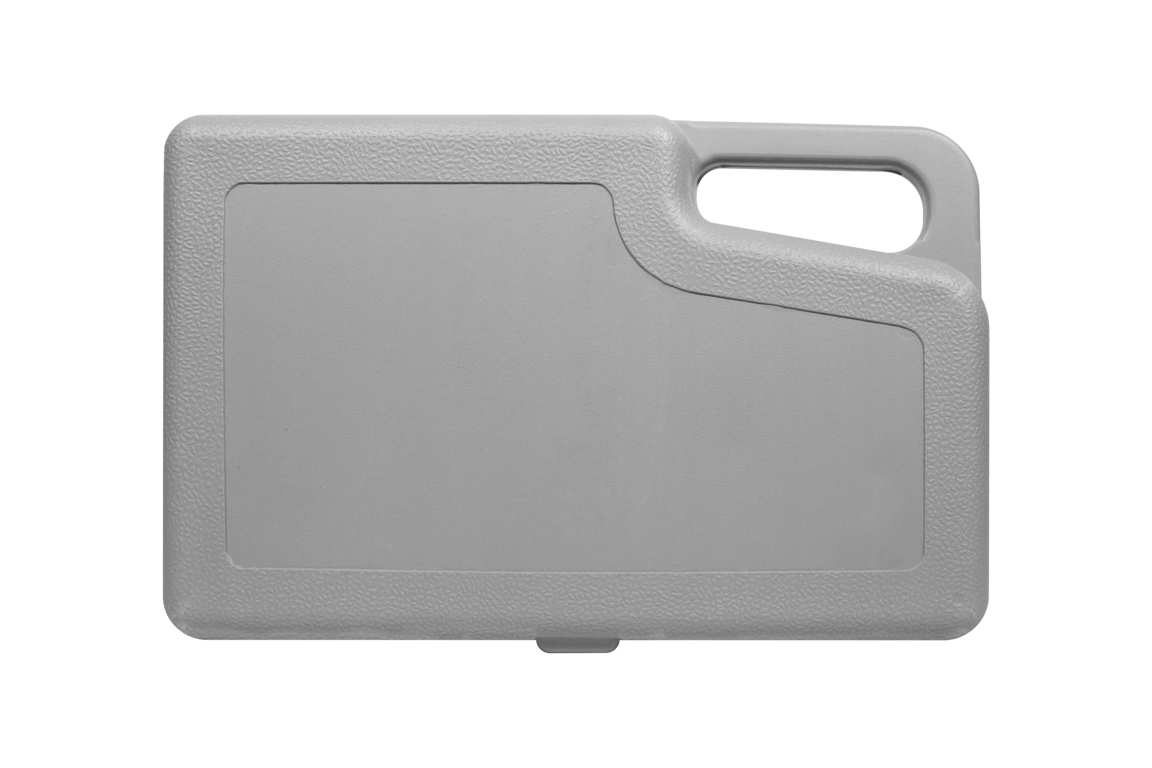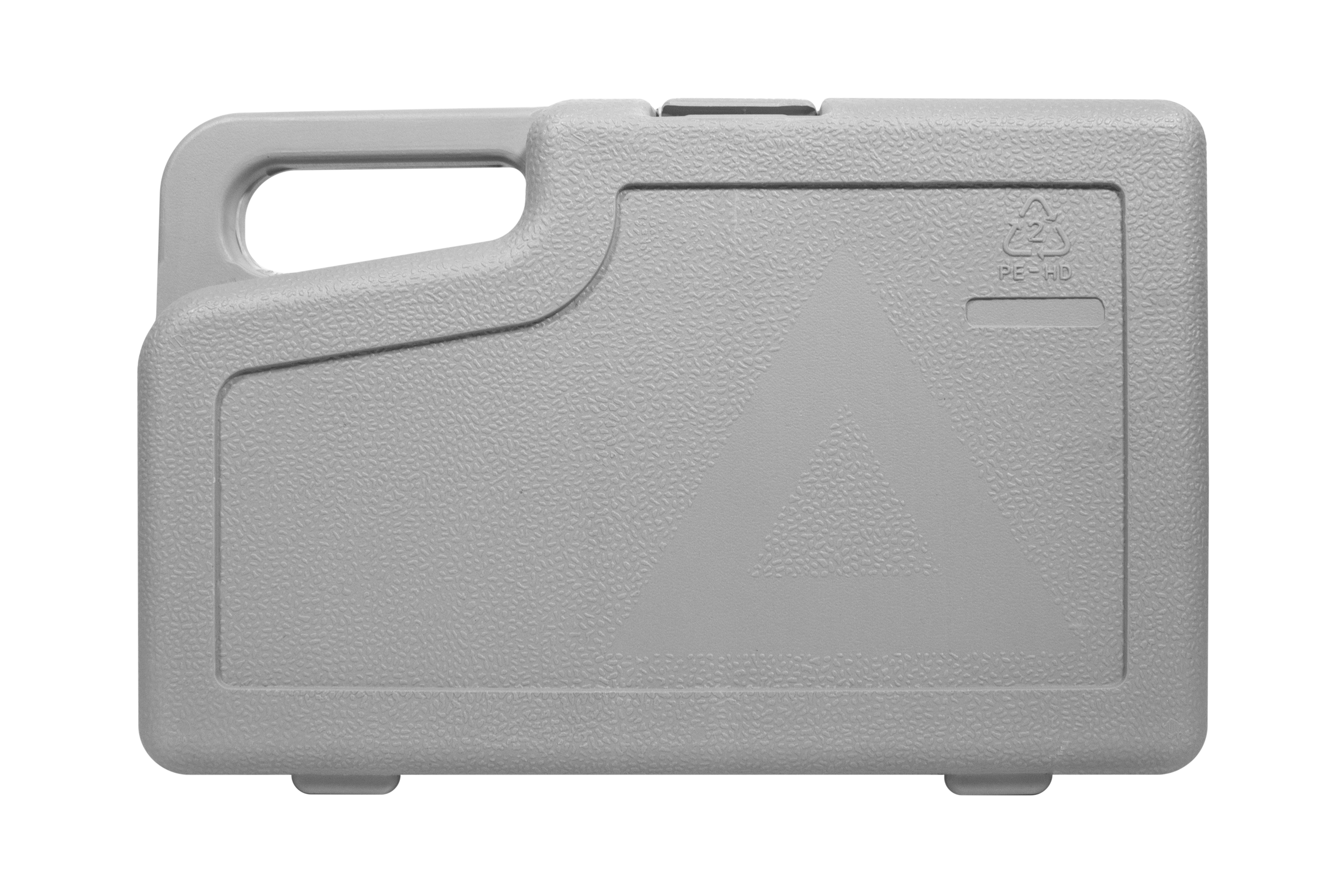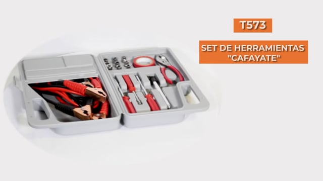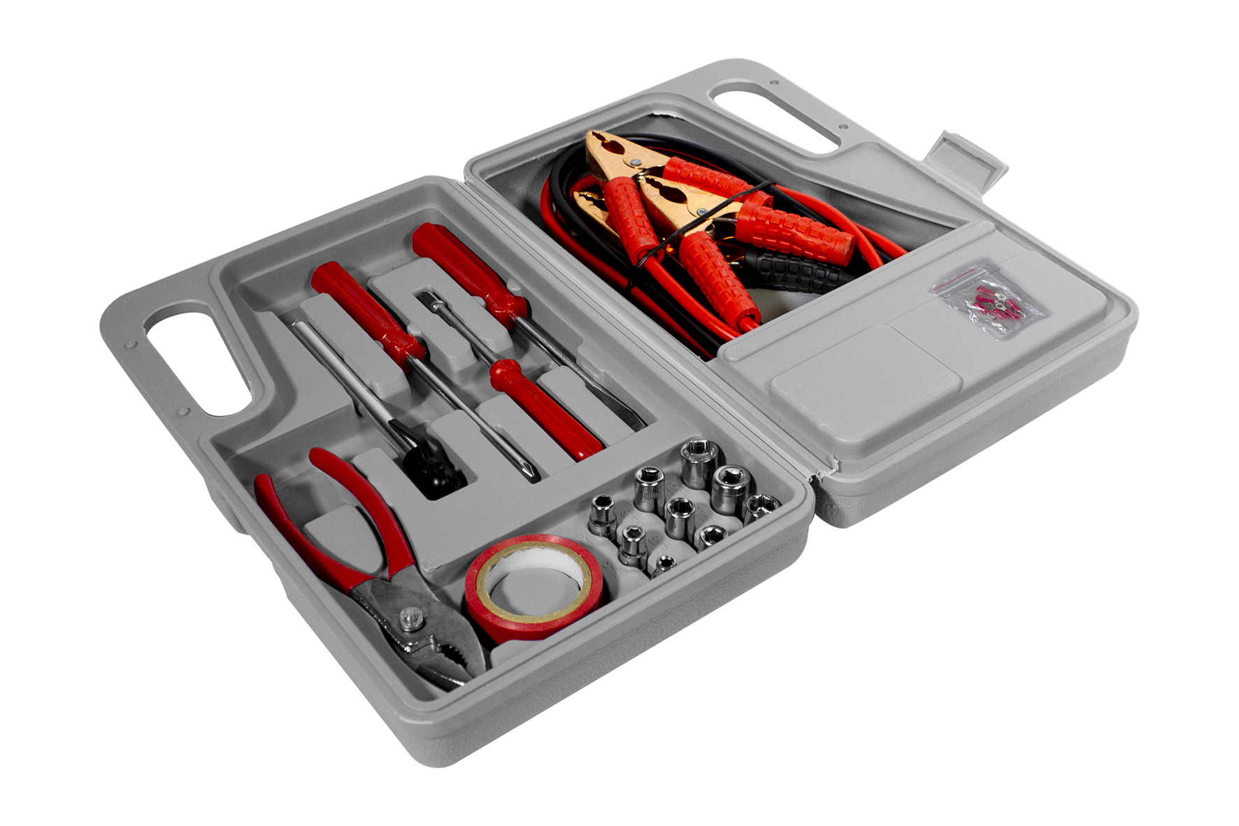 30 x 19,5 x 7,5 cm. Plástico. Set de herramientas con 3 desarmadores: 1 punta plana, 1 punta philips y un destornillador que cuenta con 9 puntas diferentes. 1 pinza, un medidor de aire para los neumáticos del auto, un cable de 1,80 mts pasa corriente, 6 conectores amphenol y una cinta aisladora.