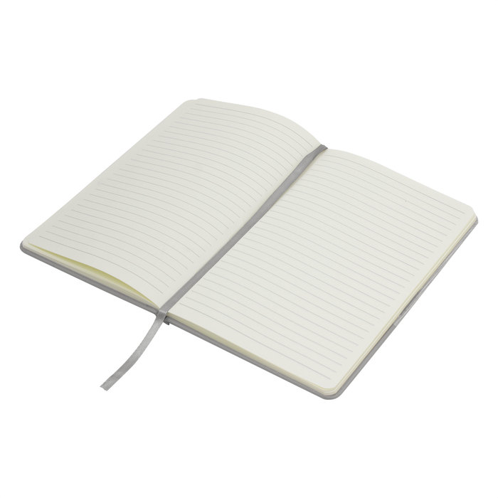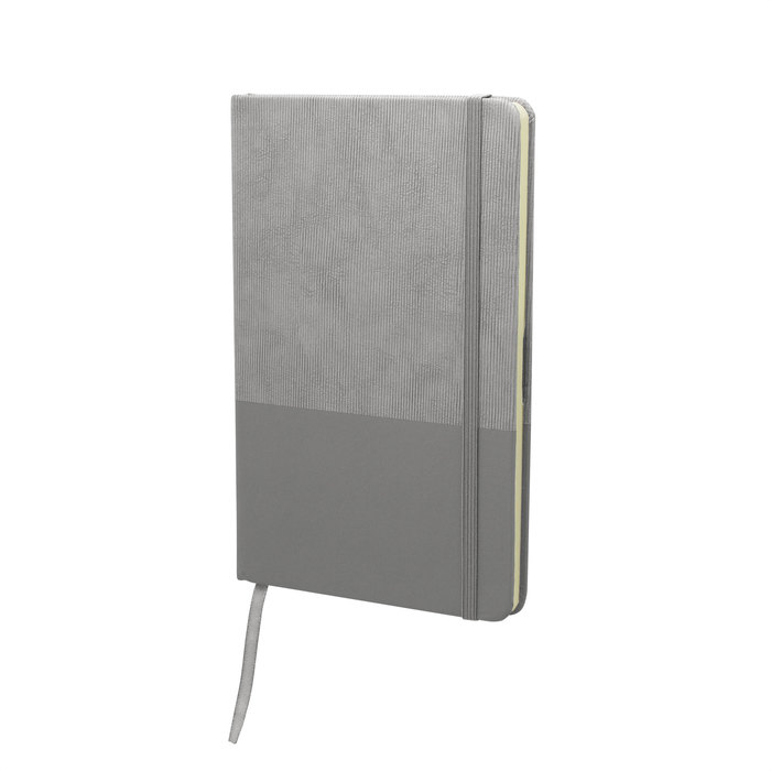 Libreta. Tapa de cartón de 1,8 mm recubierta en poliuretano bicolor con textura suave al tacto. Interior de 80 hojas rayadas en papel obra crema de 70g. Encuadernación cosido. Incluye cinta señaladora del color de la tapa. Cierre con banda elástica del mismo color.